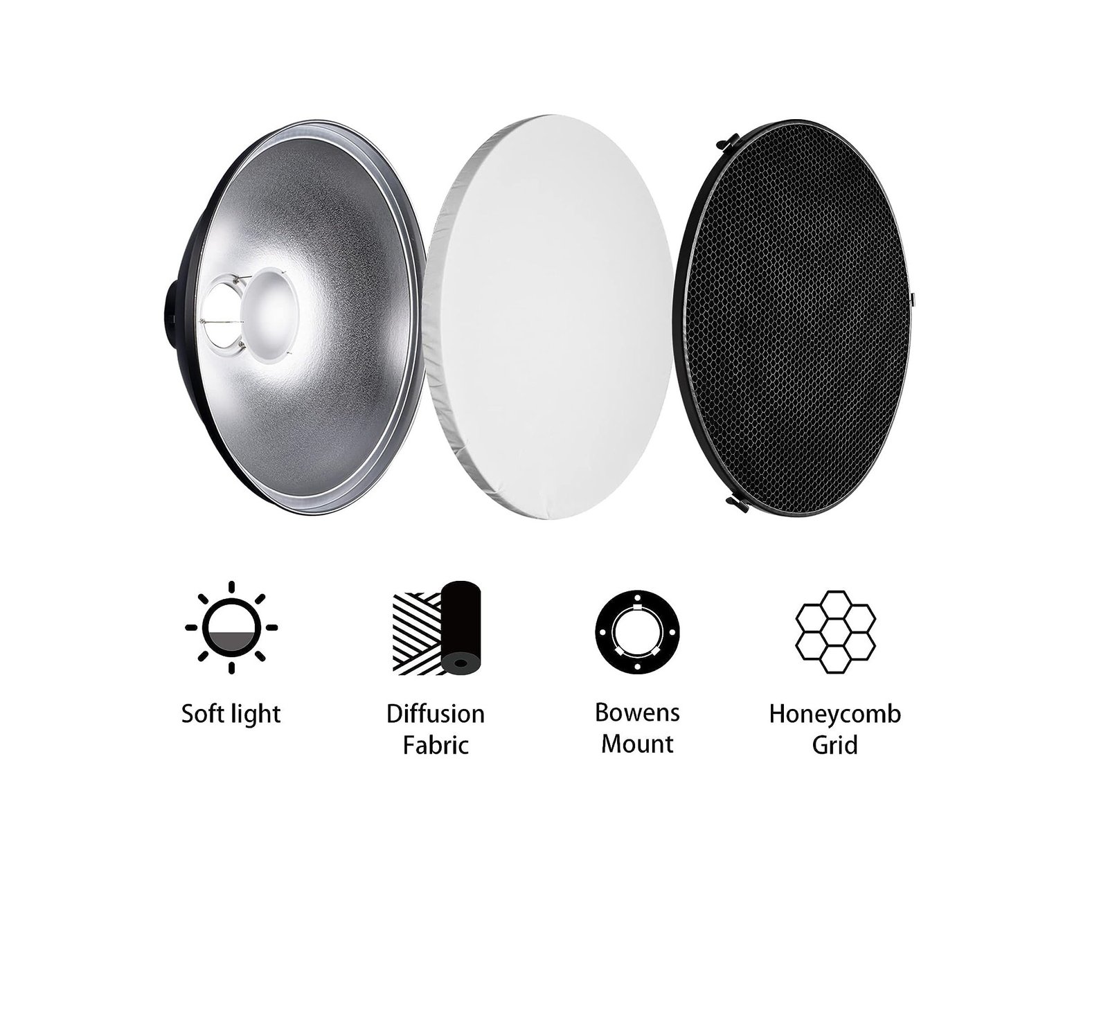 The Hpusn beauty dish 55cm With Honeycomb gives you excellent lighting control. It includes a removable honeycomb grid. Adding the grid narrows the light beam. This is perfect for creating more dramatic images. It stops light from spilling onto your background. You can also use the included diffusion sock. This sock softens the light even further, similar to a small softbox. This beauty dish a must-have tool.